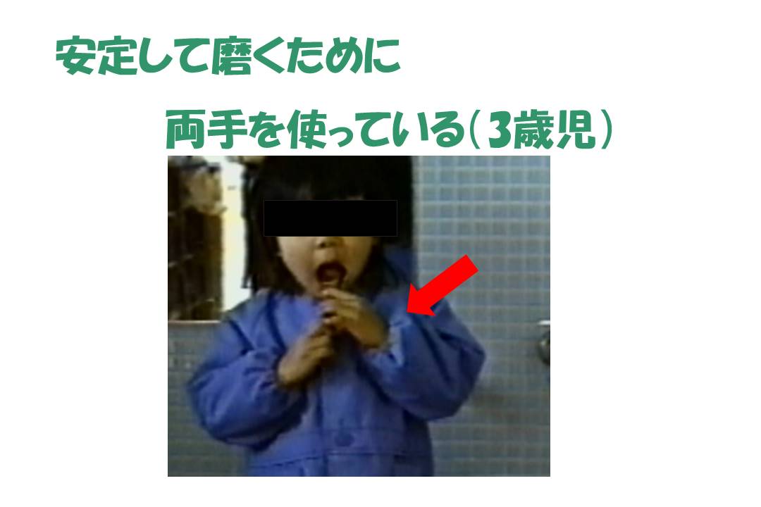 *歯ブラシの安定を得るため両手で磨こうとする(2・3歳児)