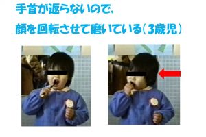 反対側(右)の臼歯を磨こうとするが、まだ手首を返すことが困難なため次の動作が見られる。