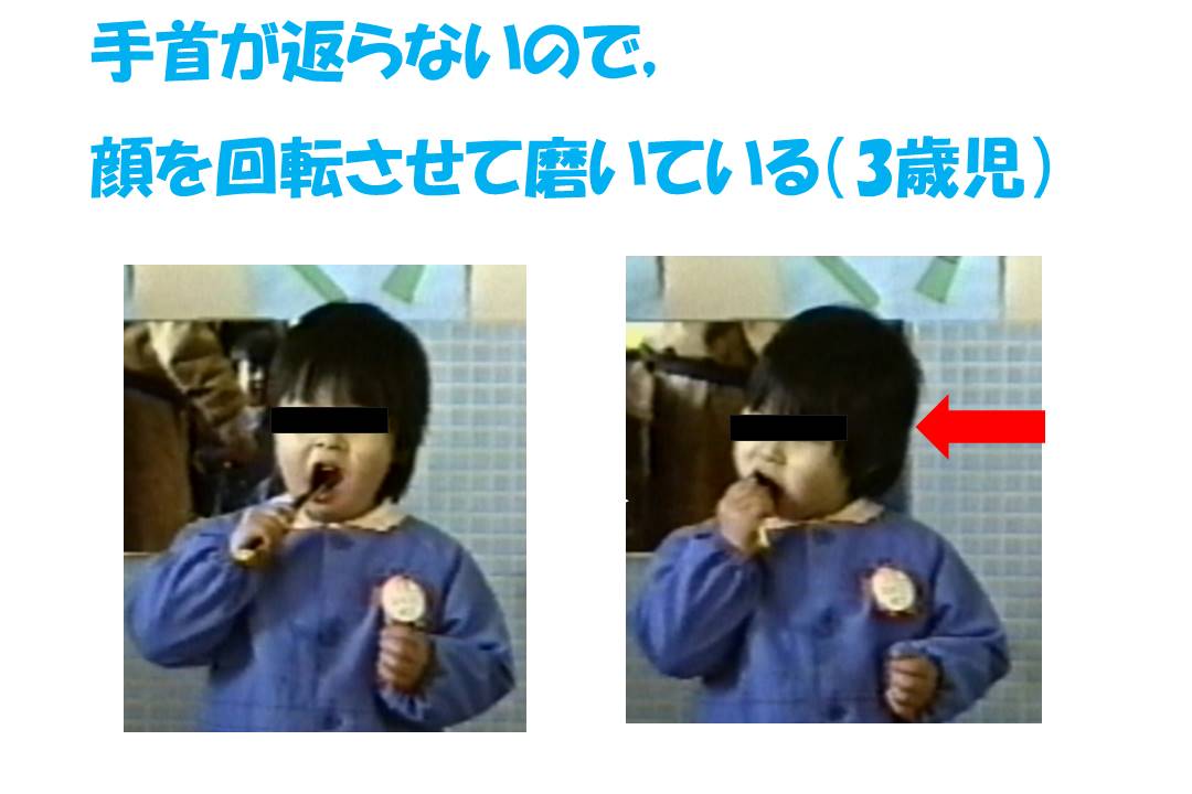 続けて、幼児に柄が太い歯ブラシを与えた場合の歯みがき動作について順を追ってみてみよう。