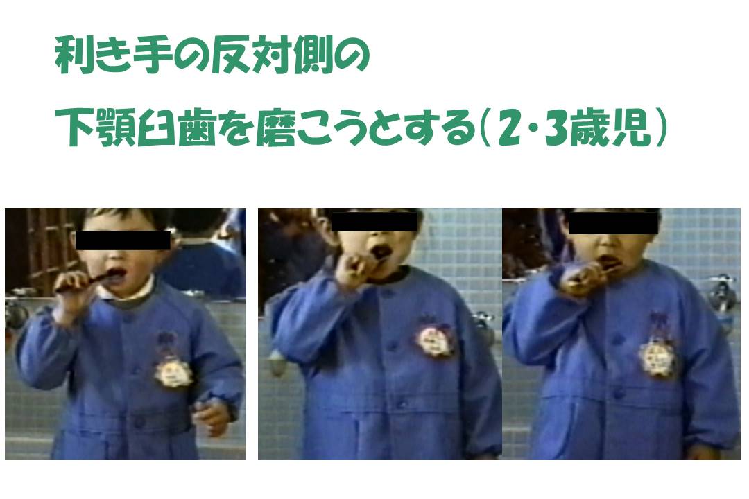 利き手(右手)と反対側の下顎臼歯部(左側)を磨こうとする。(2・3歳児)
