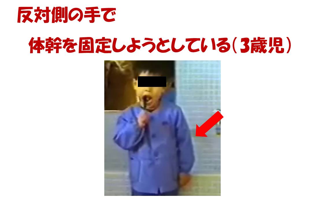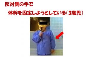 *反対側の手(左手)が動くので、その手を体幹につけて固定している(2・3歳児)