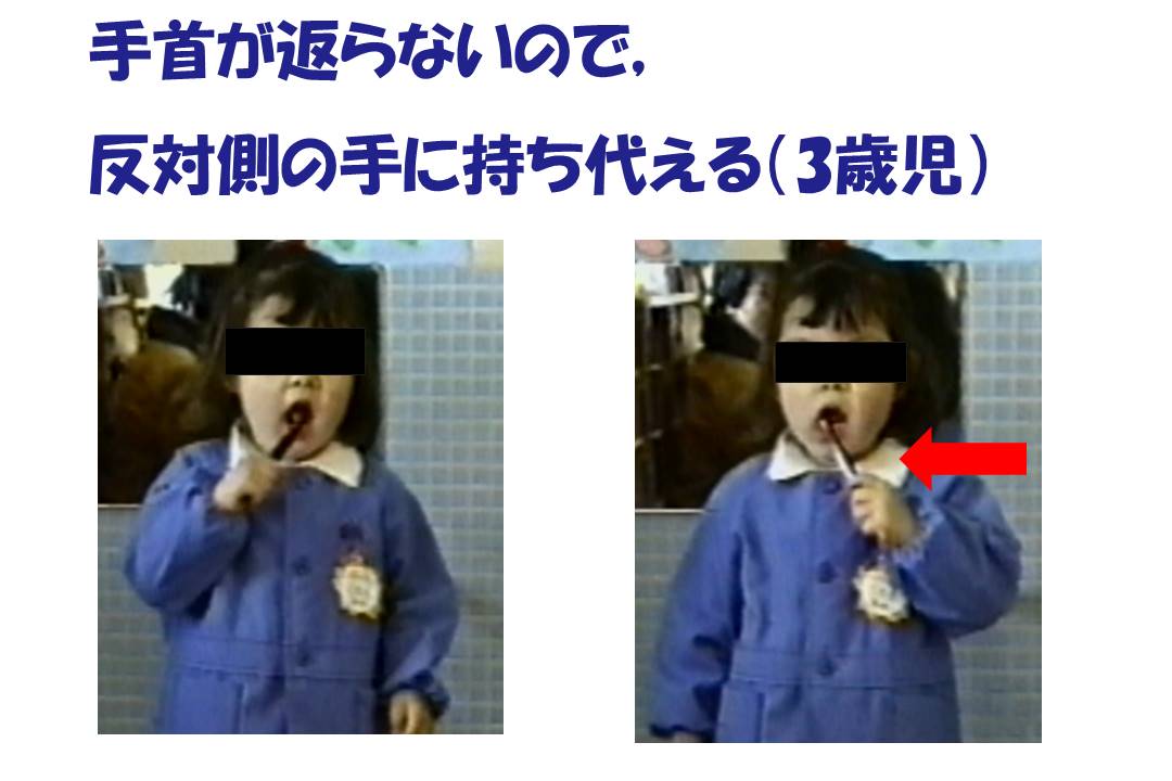 *歯ブラシを反対側の手(左手)に持ち代え磨こうとする(2・3歳児)