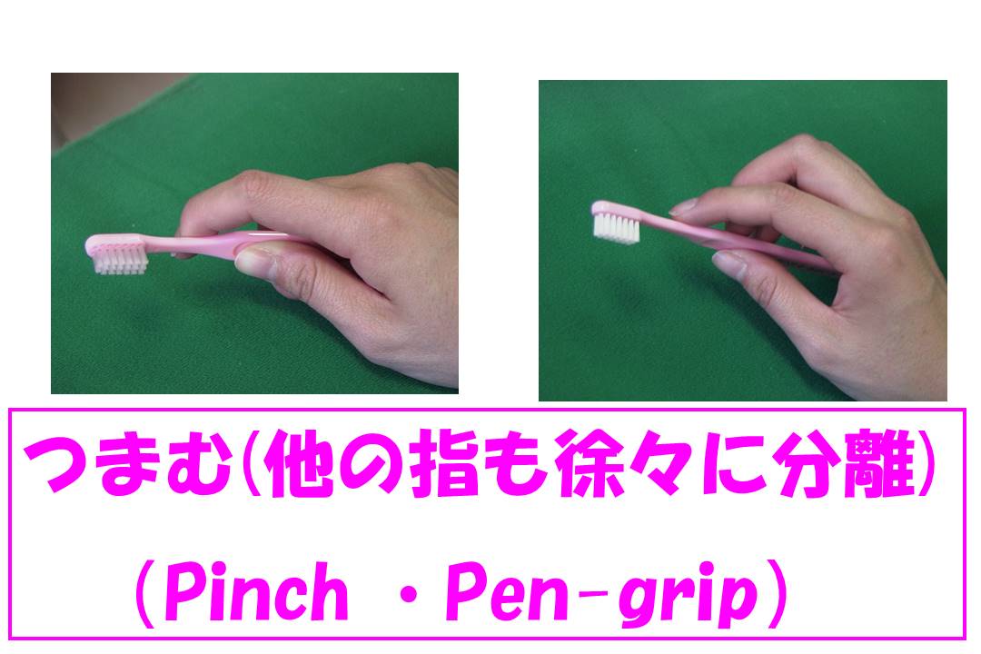 3:さらに人差し指から小指へと分離が進みながら、それぞれの指に力がつき「つまむ」(Pinch)(ペングリップ)という持ち方
