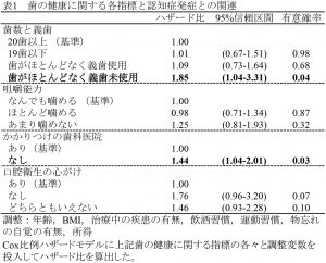 20歯以上の者を基準として、歯がほとんどなく義歯未使用の者は1.85倍、なんでも噛める者を基準として、あまり噛めない者は1.25倍、かかりつけの歯科医院がある者を基準として、ない者は1.44倍、口腔衛生を心がけている者を基準として、心がけていない者で1.76倍、それぞれ認知症発症のリスクが高かった(表1)。