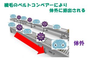 そして繊毛がベルトコンベアの様に動き、喉に向かって運び出す。