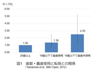 また、19歯以下であっても義歯を使用している者の転倒リスク(オッズ比)は1.36であり、20歯以上の者との間に有意差は見られなかった。