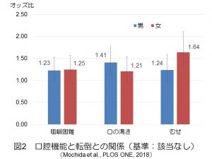 特に、男性では口渇が気になると回答した者は1.41倍、女性ではむせることがあると回答した者は1.64倍、有意に転倒リスクが高かった。