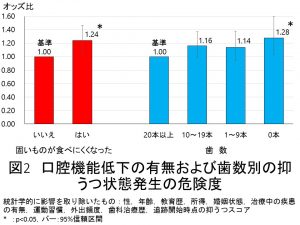性、年齢、教育歴、所得、婚姻状態、治療中の疾患の有無、運動習慣、外出頻度、歯科治療歴、追跡開始時点の抑うつスコアの影響を考慮したロジスティック回帰分析で明らかに高かったのは、「半年前に比べて固いものが食べにくくなりましたか」に「はい」の回答で1.24(95%信頼区間:1.04~1.47、「いいえ」の回答が基準)、そして無歯顎で1.28(95%信頼区間:1.03~1.60、20歯以上が基準)であった(図2)。