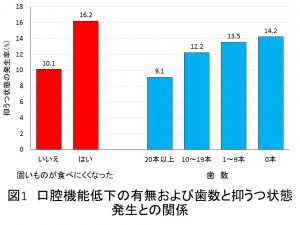 本研究結果から、固いものが食べにくくなったと自覚している者や無歯顎者は、その後に抑うつ状態となる危険度が高いことが示された。