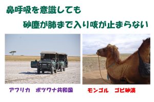サファリカーで草原を走り回るのだが、鼻呼吸を意識しても、細かい砂塵が肺に入り込む。