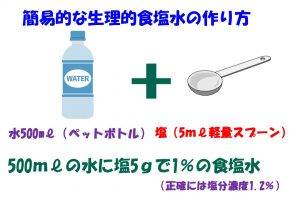 まずペットボトルに、生理的食塩水を入れる。