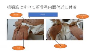 図2のとおり、4つの咀嚼筋はすべて、頬骨弓内面に付着しています。