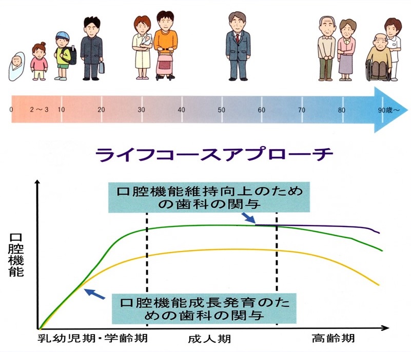 近未来の歯科医師は、う蝕・歯周病の治療~予防だけでなく、成長発育期に口腔機能を健全に発達させ、成人期にはその口腔機能維持を保ち、高齢期にはそれらの低下を防ぎ、健康寿命の延伸に貢献していかなければならない(図3)。