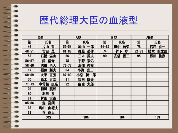 さて、我が国の歴代総理大臣の血液型を調べてみたら、圧倒的にO型が多い。