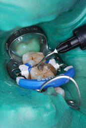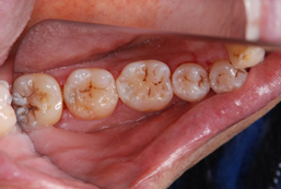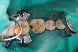 図2 左下第一大臼歯の頬面の破折と遠心隣接面の象牙質う蝕をフロアブルレジンで修復。