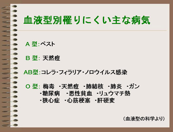 O型は、あらゆる病気に抵抗力を持ち、なかでも梅毒と結核には感染しにくい。