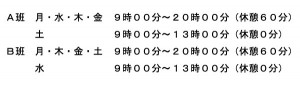 労働時間は次のとおりとし、班区分は各月がはじまる1週間前までに各スタッフに通知する。