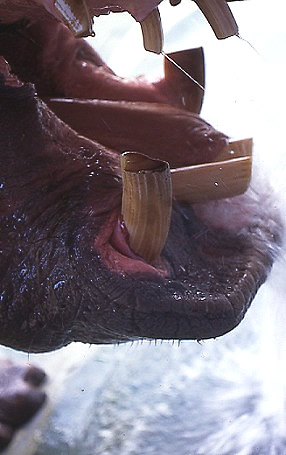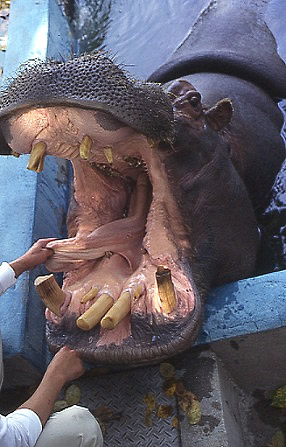 カバの前歯や牙(犬歯)は無根歯であり、生涯歯が伸び続ける。