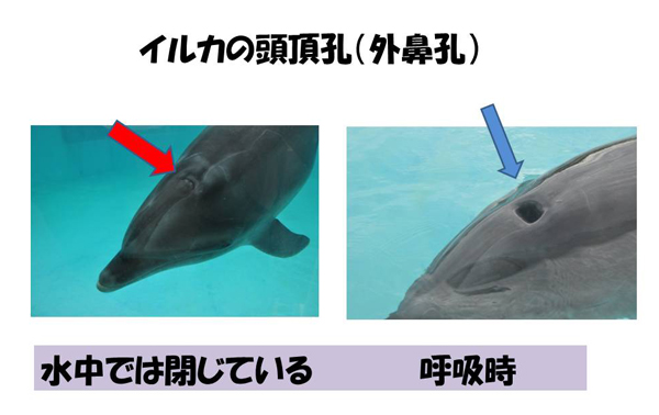 いやまてよ・・・、確かイルカの外鼻孔(噴気孔)は頭頂部に開いていた。