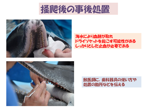 イルカの口蓋部の掻爬を終えた後には、感染予防と止血の処置が待っている。