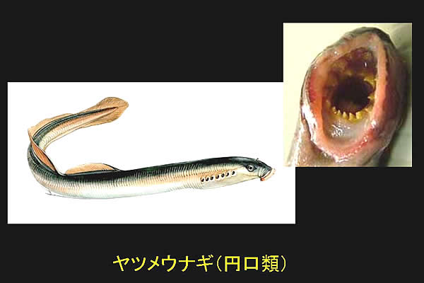 “ヤツメウナギ”と言っても、ウナギの仲間ではない。目のうしろに7つのエラ穴があり、目が合計8つあるように見えるので、こう名づけられた。円口類に属し“アゴのない魚”として有名である。歯でサケやマスの表皮を破り、血液や体液を吸いとって生きている。