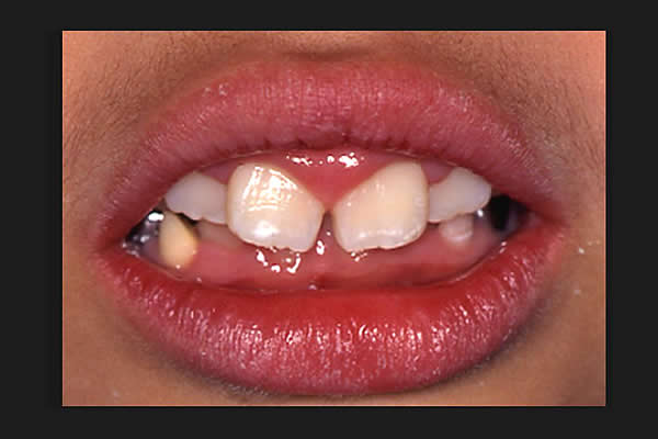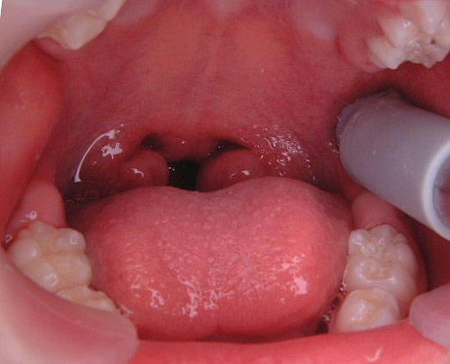 口呼吸性の歯肉炎だ。プラークの付着による歯肉炎とは異なり、歯を磨いても治らない。外気がそのまま、歯肉に当たるので肥厚するのだ。さらに、扁桃腺を見てみると、腫れている子が多い。