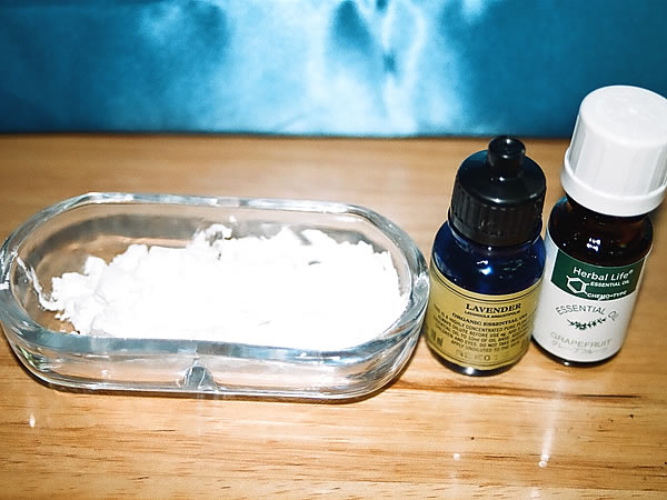 ・コーンスターチ大さじ3+オレンジスィート、ラベンダー、レモングラスなど5滴(精油は1~2種合わせて5滴でもいいです)。
