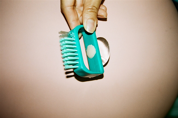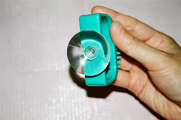 義歯用ブラシ(デント・エラック710M ライオン歯科材株式会社)に100円ショップの吸盤を取り付けました。