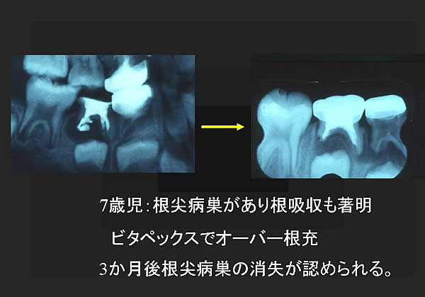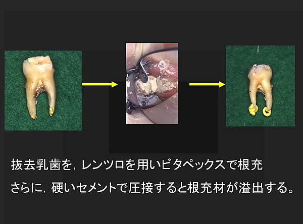 根の吸収が進行している場合は、ビタペックスの吸収が早いので、根尖部のみビタペックスを用い、さらに他の根管充填材を用いる場合もあります。