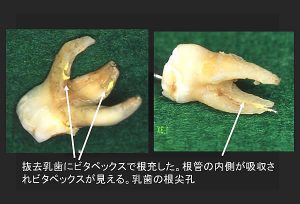 綿栓を取っただけで出血や滲出液のでる場合は、根の吸収がすすんでいると考えられます。