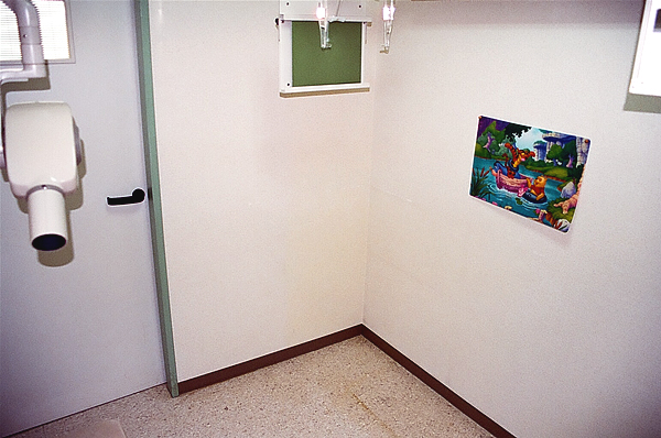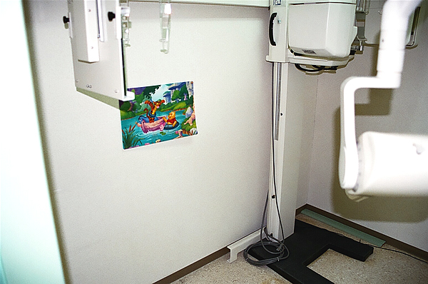 レントゲン室の患者さんが座る正面に、キャラクターのステッカーや小さいポスターを貼り、「イチ、ニィ、サンの間、この〇〇さんを見ていてね」と指示します。