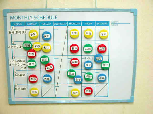 ホワイトボードとマグネットを使って当番表を作った医院がありました。