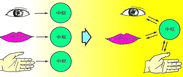 出生時においては、脳と目、脳と手、脳と口と、それぞれが独立した回路であり、脳の中ではつながっていないのだ。