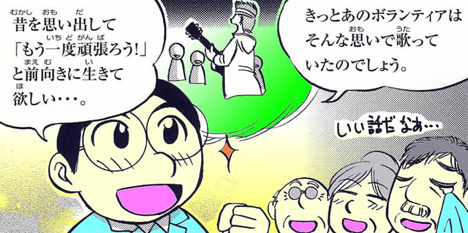 その勇気づけ・励ましになるのが、自分が好きだった歌、みんなと一緒に歌った青春の歌のように思う。