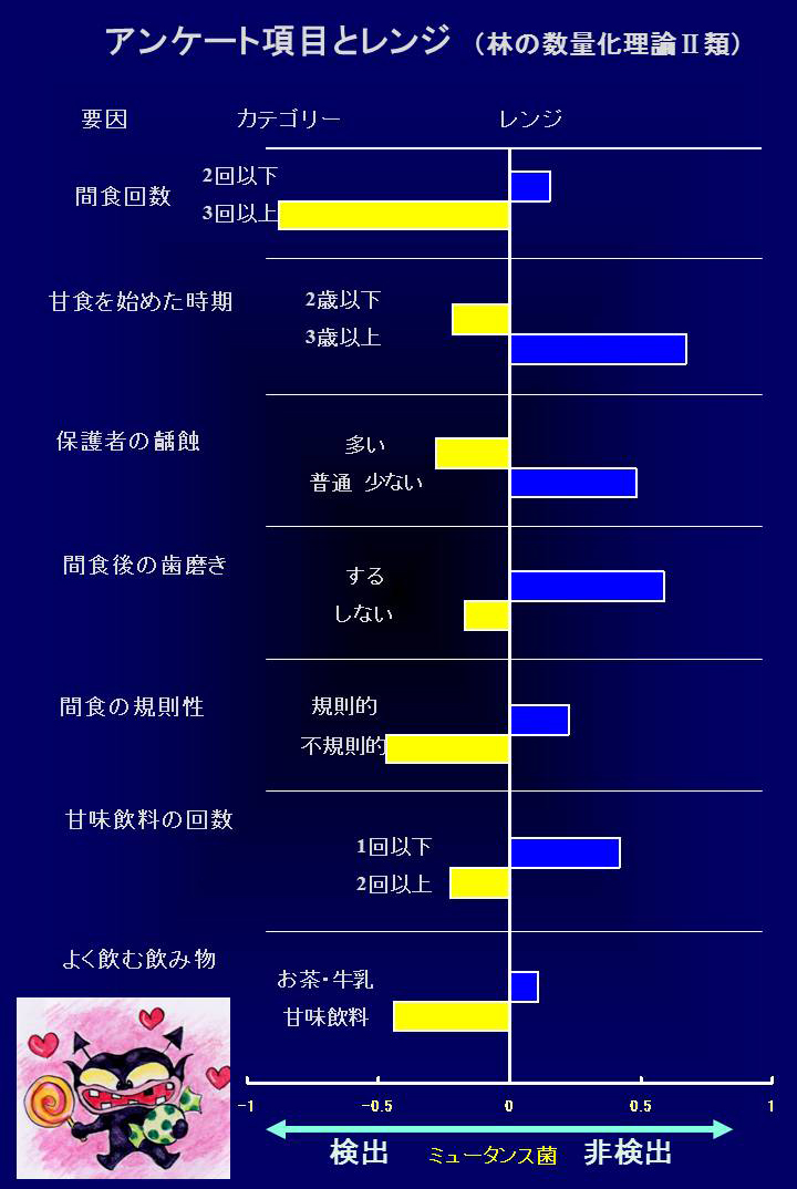 全体的に眺めるとミュータンス菌の存在には、乳幼児期の食生活の項目が強く関与していた。