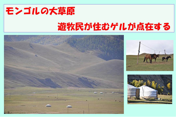遠くには遊牧民の住む移動式テントのゲルが点在する。