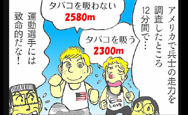 非喫煙の兵士は、2,580m走ったのに対し、喫煙の兵士(30本/日)は2,300mしか走れなかった。