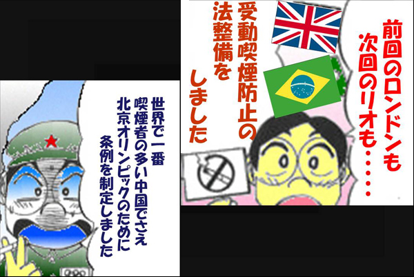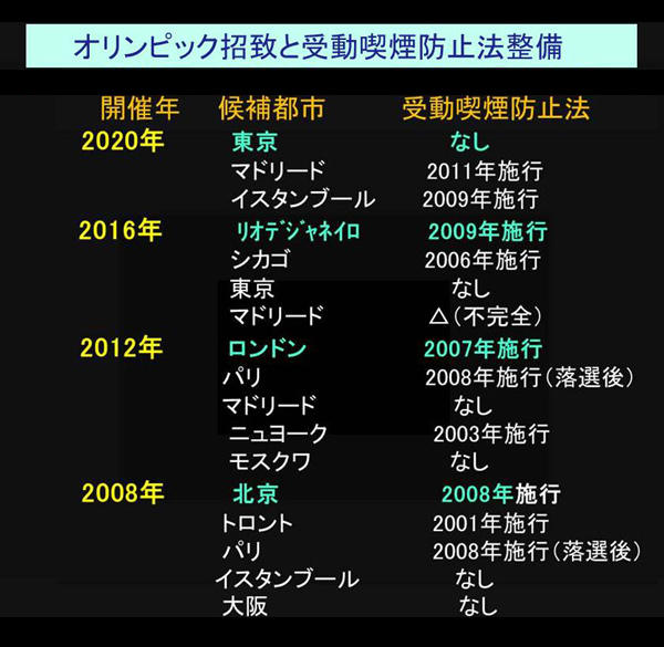受動喫煙の防止に関しては、前回のロンドン、次回のリオデジャネイロも法律もしくは条例が施行された。