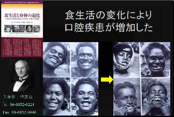 その結果、伝統的な食物から精製された食物へ変わることで、う蝕だけでなく歯周病や不正咬合も増えたことを豊富な口腔内写真を基に実証していた。
