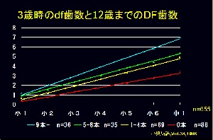 3歳で乳歯う蝕のない小児は、12歳での永久歯う蝕の平均は約3.4歯。