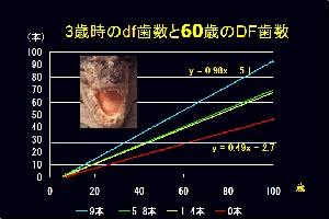 ちなみにこの状態でう蝕が増え続けるとすると、う蝕なし群では60歳で約27歯。