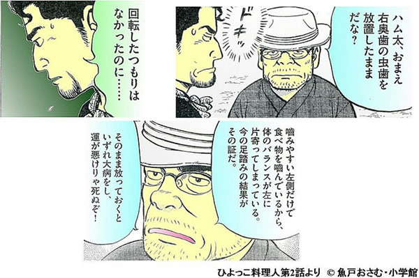 右側のむし歯を放置しているために顎位が変わったのだ。歯は、体のバランス感覚と密接に関係し姿勢や歩行に影響することがわかる。歯科関係者にとって影響力の大きい雑誌に、歯の重要性について描いていただくことは大歓迎である。