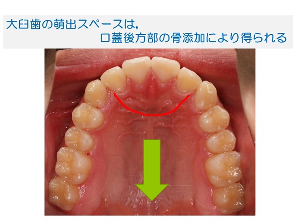 つまり大臼歯部の萌出スペースは、口蓋の後方部に骨が添加することで得られる。