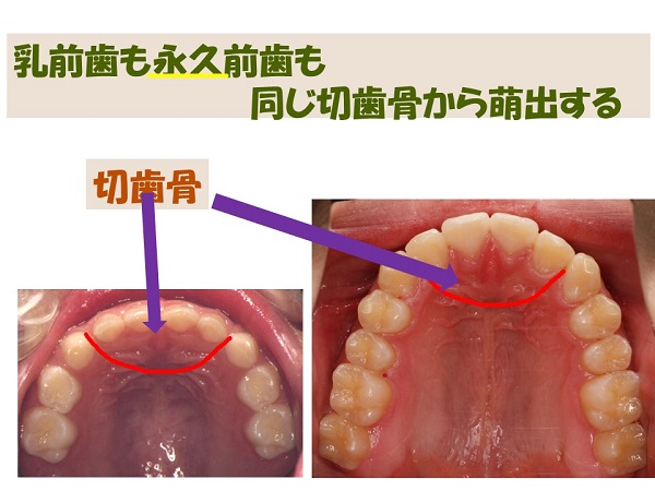 すなわち乳前歯も永久前歯も、切歯骨から萌出ことになる。