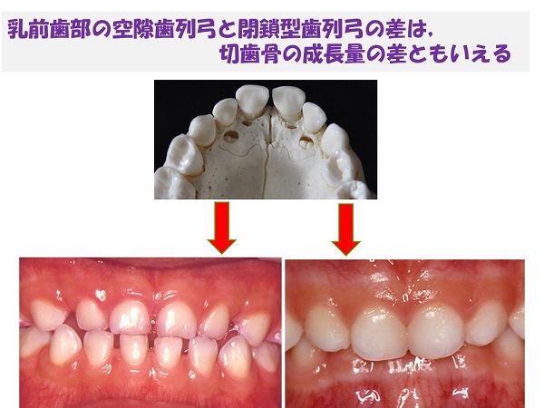 例えば、乳前歯に空隙があると、永久前歯はきれいに並ぶ。