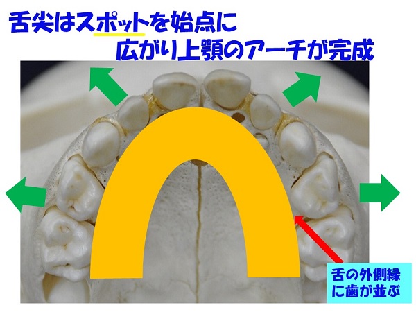次に嚥下時、舌尖がスポットに当たる力が、切歯骨を前方に成長させる。