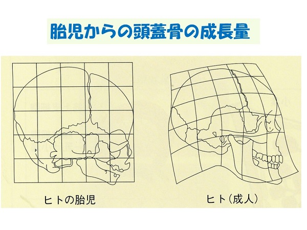 さてこの図は、頭蓋骨の胎児から成人までの成長量の差。