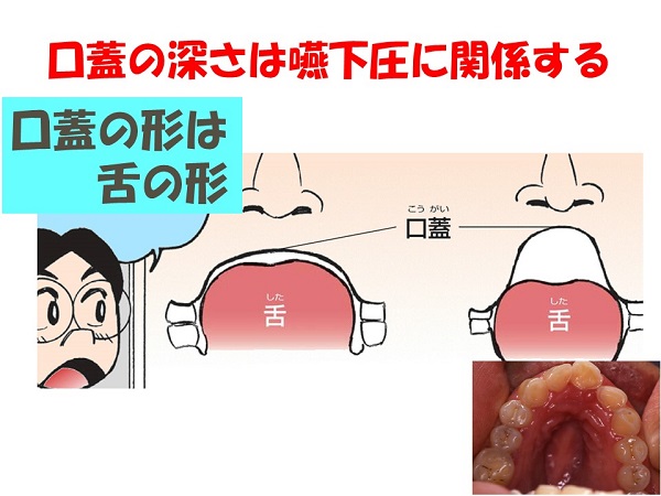 口蓋突起は生後も伸び続けるため、舌の挙上が不十分だと口蓋が高くなる。