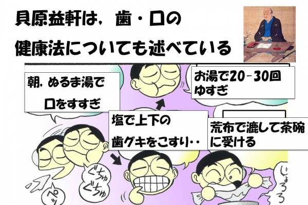 養生訓を著した貝原益軒は、歯や口にまつわる健康法についても述べている。