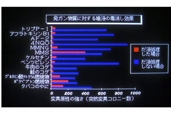 多くの発ガン物質を唾液に30秒間漬けると、発ガン作用(変異原性)が著明に低下する。